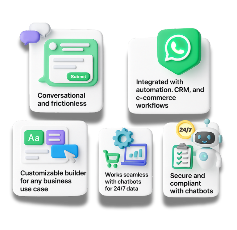 Replace clunky web forms with interactive WhatsApp Forms. Capture leads, feedback, and confirmations without taking customers out of the conversation.